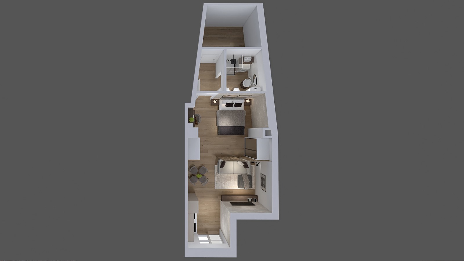 L’immobile si presenta completamente ristrutturato con materiali moderni ed è composto da ingresso sulla zona living ben organizzata, con cucina a vista e bagno con box doccia.